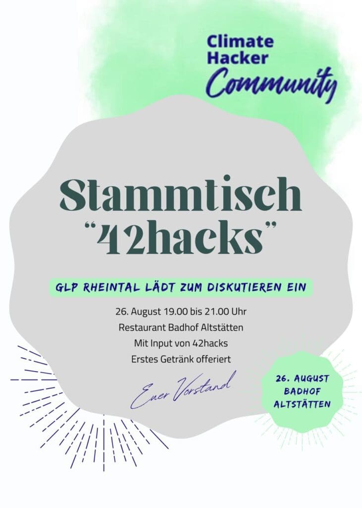 Die GLP Rheintal lädt zu ihrem nächsten Stammtisch am 26. August ihre Mitglieder sowie Sympathisanten ein